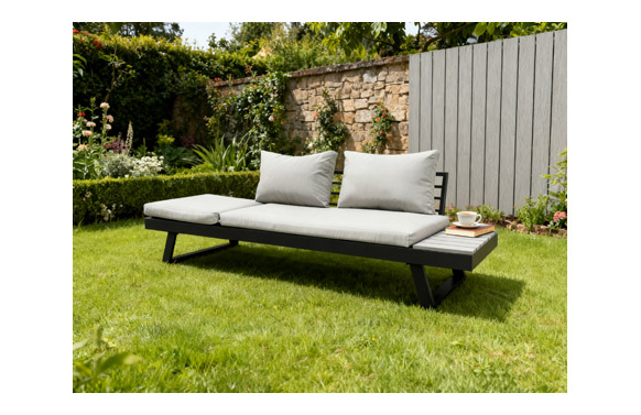 Estructura de aluminio color gris antracita y cojín poliéster de color gris de 220 gr/m2 y 8 cm de grosor, tablero de polywood color madera. Respaldo con 4 posiciones ajustables. 228x78x66.5/41 cm.